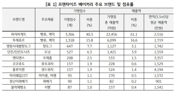 이 중 대표 프랜차이즈인 파리바게뜨는 전체 가맹점 수의 40.3%(3366개), 매출의 61.1%(2조2456억원)를 차지했다. 이어 뚜레쥬르가 전체 가맹점 수의 15.8%(1318개), 매출 비중은 16.6%(6099억원)로 뒤를 이었다. 두 브랜드 합산시 전체 가맹점 수의 56.1%(4684개), 매출의 78%(2조8555억원)를 차지한다.