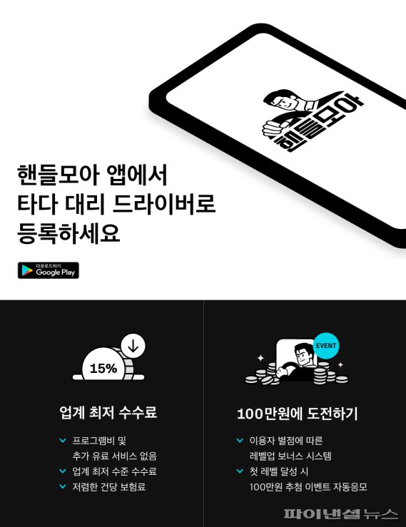 VCNC는 오는 28일 출시할 예정인 대리운전 서비스 ‘타다 대리’ 관련, 대리운전 드라이버를 위한 애플리케이션(앱) ‘핸들모아’를 출시한다고 20일 밝혔다. 대리운전 드라이버는 핸들모아를 통해 타다 대리 콜을 받아 차량을 운행하고 본인의 운행 이력 등을 관리할 수 있다.