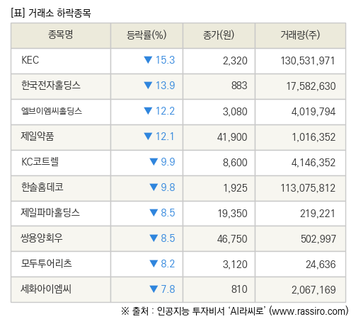 [fnRASSI]장마감, 거래소 하락 종목(KEC -15.3% ↓)