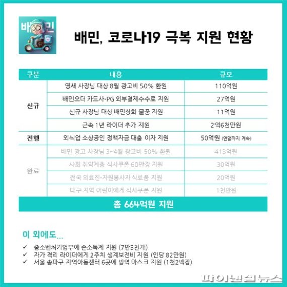 또 코로나19 대응 관련 음식 포장 및 배달을 권장하고 있는 방역당국의 지침에 맞춰 ‘포장 및 주문’ 등록 업주를 위한 지원책도 마련했다. ‘포장 및 주문’을 통해 소비자가 주문·결제하면 식당들이 카드사나 전자지급결제대행(PG)업체에 지불하는 외부결제수수료(3%)를 우아한형제들이 지원하는 형태다. 우아한형제들은 올 연말까지 ‘포장 및 주문’에서 생기는 외부결제수수료를 각 식당에 비즈포인트로 돌려주는 형태로 대납할 예정이다. 예상금액은 약 27억 원이다. 해당 업체는 비즈포인트를 활용해 광고비를 지불하거나 자영업자 대상 전문 식자재 쇼핑몰 ‘배민상회’에서 필요한 물품을 구입할 수 있다. 이와 함께 우아한형제들은 배민라이더스에서 1년 이상 일한 라이더에게 감사비 50만원을 지급할 방침이다. 대상자는 모두 518명이다.
