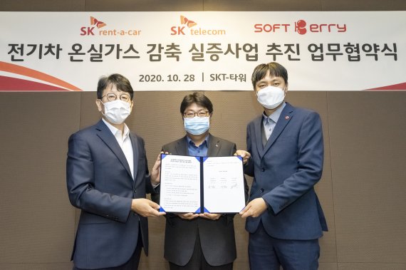SK렌터카는 28일 서울 을지로 T타워에서 윤민호 사업개발실장과 이준호 SK텔레콤 SV추진그룹장, 박용희 소프트베리 대표이사 등 3사 관계자들이 참석한 가운데 '국내 전기차 사용자 확산을 통한 지구온난화 방지 및 기여하는 사회적 가치 창출'을 함께 추진키로 하는 공동협약을 체결했다.