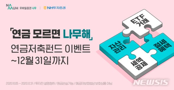 [서울=뉴시스] 유자비 기자 = NH투자증권은 연말까지 모바일증권 나무 고객을 대상으로 연금저축펀드 이벤트 '연금 모르면 나무해'를 진행한다고 28일 밝혔다.