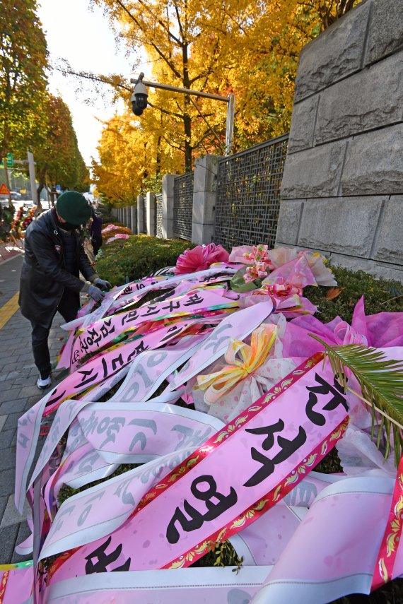 윤석열 검찰총장을 지지하는 보수성향의 시민단체 자유연대 회원들이 2일 오전 서울 서초구 대검찰청 청사 앞 화환을 자진 철거하고 있다. 사진=서동일 기자