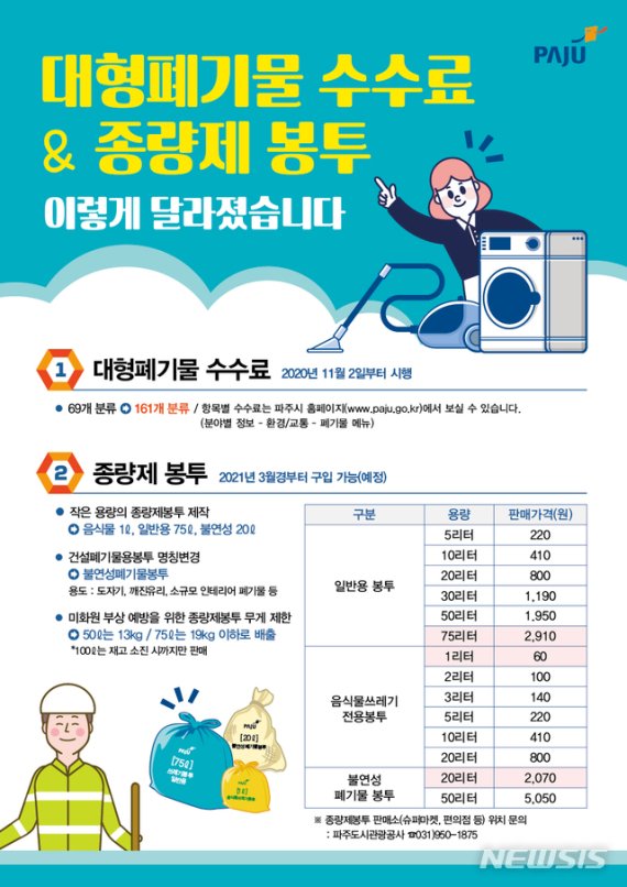 파주시 관계자는 “새로운 규격의 종량제 봉투는 제작기간을 거쳐 내년 3월께부터 시중에 유통될 것”이라고 말했다.