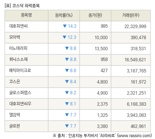 [fnRASSI]장마감, 코스닥 하락 종목(대호피앤씨 -14.2% ↓)