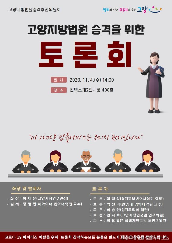 이번 토론회는 고양지방법원 승격을 위해 각계 전문가 의견을 수렴하고 시민 공감대 확산을 위해 열리며 향후 실효성 있는 추진 전략과 동력을 모색한다.