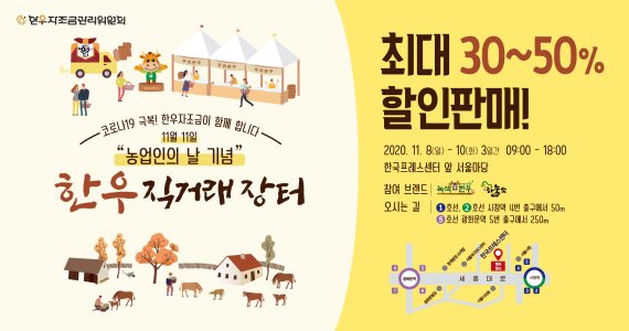 한우자조금은 오는 8일부터 10일까지 서울 중구 프레스센터 앞에서 '한우 직거래장터'를 개최한다. 매년 명절에 개최하던 한우직거래장터는 올해는 코로나19로 연기돼 사회적 거리두기를 준수하고자 '워킹스루(Walking thru)' 형식으로 진행한다. 이번 한우직거래 장터에서는 한우를 시중가격대비 30~50% 저렴하게 구매할 수 있다.
