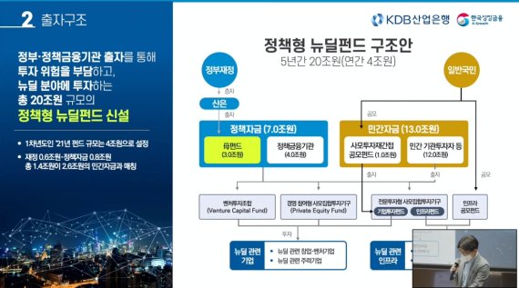 이에 노해성 한국성장금융투자운용 투자운용실장은 "향후 5년간 정책자금 7조원, 민간자금 13조원 등 20조원을 정책형 뉴딜펀드로 결성할 계획"이라며 "내년 펀드 규모는 4조원이 목표"라고 설명했다.
