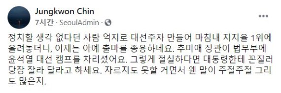 진 전 교수는 이에 대해 "추 장관이 윤석열 대선 캠프를 차리셨다"며 "그렇게 (윤 총장 사퇴가) 절실하다면 대통령한테 꼰질러 당장 잘라 달라고 하세요"라고 일침을 가했다.