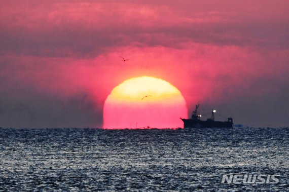 [남해=뉴시스]차용현 기자 = 13일 오전 경남 남해군 삼동면 물건마을에서 바라본 남해바다에 붉은 태양이 솟아 오르고 있다. 2020.11.13. con@newsis.com [남해=뉴시스] 차용현 기자 = 13일 오전 경남 남해군 물건항에서 바라본 남해바다에 붉은 태양이 치솟고 있다.