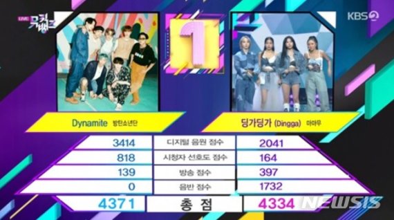 BTS의 '다이너마이트'는 13일 방송된 KBS 2TV '뮤직뱅크'에서 마마무의 '딩가딩가(Dingga)'와 경합해 11월 2주차 1위를 차지했다.