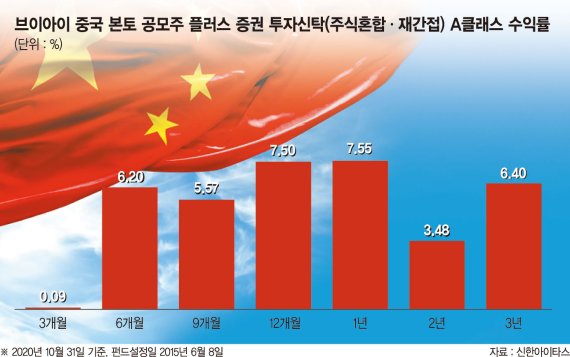 15일 펀드 사무관리회사 신한아이타스에 따르면 지난 10월 31일 기준 브이아이 중국 본토 공모주 플러스 증권 투자신탁(주식혼합-재간접) A클래스 1년 수익률은 7.50%를 기록했다. 3개월 0.09%, 6개월 6.20%, 9개월 5.57%, 2년 7.55% 순이다.