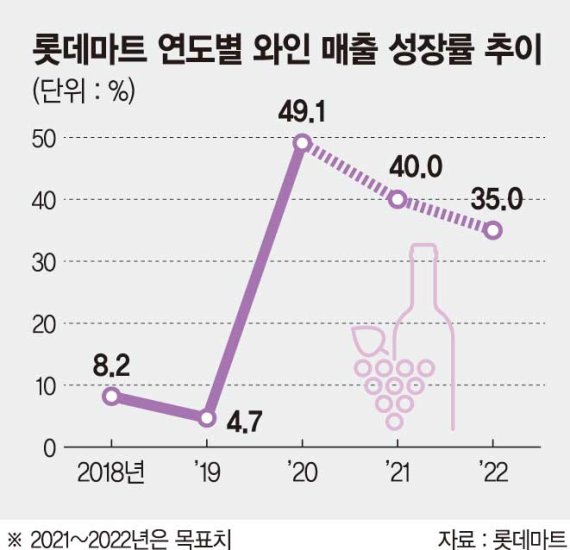 롯데마트는 와인의 매출 신장률 목표를 2021년 40%, 2022년 35%로 각각 제시했다. 롯데마트 이영은 주류팀장은 "와인은 올해 1~10월 50% 가까운 매출 신장률을 기록하면서 무한한 성장 가능성을 보이고 있다"며 "매장 운영 차별화, 직원 전문성 확대 등을 통해 고객들이 와인하면 롯데마트를 떠올리도록 할 것"이라고 말했다.