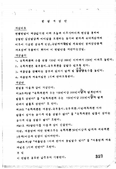 제69조 3항 "대통령은 1차에 한하여 중임할 수 있다"를 "대통령의 계속 재임은 3기에 한한다"로 한다. (헌법개정 제의의 공고, 1969년)