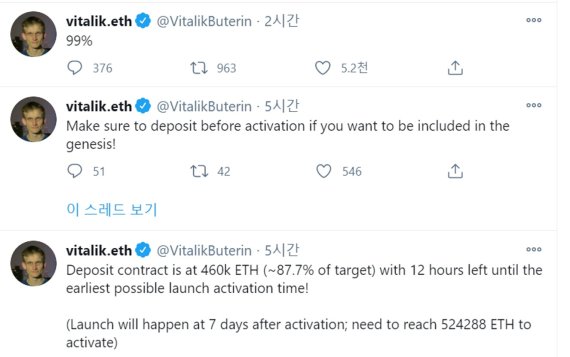 이더리움2.0 입금 계약 진행 상황을 1시간 단위로 전하던 'Eth 2.0 Deposit Contract - Progress Meter Bot' 트위터 계정은 24일 오전 11시 30분경 로케트가 발사되는 장면과 함께 "이를 가능케한 개발자들, 연구원들, 교육자들, 커뮤니티 구성원들에게 감사를 전한다"며 "협정세계시(UTC) 12월 1일 정오에 보자"며 이더리움 2.0입금 계약 목표치 달성을 알렸다.