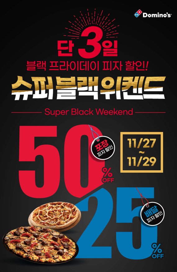 도미노피자는 오는 27일부터 29일까지 피자 포장 50%, 배달 25% 할인하는 '슈퍼 블랙 위켄드' 프로모션을 진행한다. 여타 중복할인은 불가능하나, 사이드 디시 반값과는 중복 적용 가능하다.