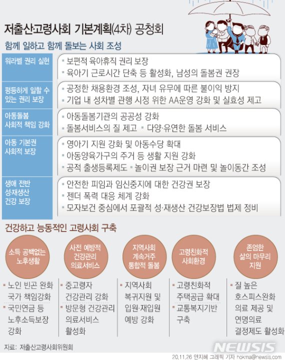 대통령 직속 저출산·고령사회위원회는 26일 오전 10시 '제4차 저출산·고령사회 기본계획 시안 공청회'를 열고 기본계획 시안을 공개했다.