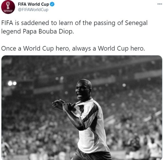 국제축구연맹(FIFA)은 30일(한국시간) "세네갈의 전설 디오프의 죽음에 애도를 표한다"고 전했다.