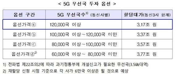과기정통부는 5G 도입 영향에 따른 대가 분석 결과에 따라 통신사별로 2022년까지 5G 무선국을 12만 국 이상 구축하는 경우 총 3.17조 원까지 가치가 하락하고 5G 무선국 구축 수량이 12만 국에 못 미칠 경우 할당대가가 높아지는 구조로 정했다.