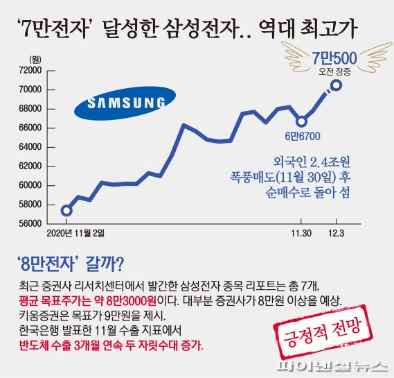 12월 3일 오전 10시50분 현재 삼성전자는 전날보다 800원 오른 7만200원에 거래되고 있다. 삼성전자는 이날 6만9500원에 출발해 오전 장중 7만500원까지 오르며 역대 최고가를 재경신했다.