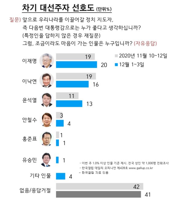 4일 한국갤럽 12월 1일부터 3일까지 사흘 동안 전국 18세 이상 1000명을 대상으로 진행한 설문조사 결과, 이 지사는 지난 11월 조사 대비 1%포인트 상승한 20%로 단독 1위를 기록했다.