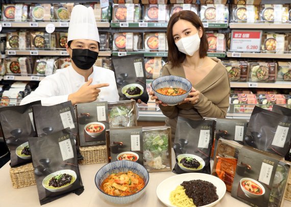[파이낸셜뉴스] 6일 이마트 성수점 밀키트 매장에서 모델들이 '조선호텔 유니짜장', '조선호텔 삼선짬뽕' 밀키트를 소개하고 있다.