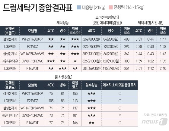 시험 대상 제품은 Δ삼성전자 대용량(WF21T6300KP) Δ삼성전자 중용량(WF14F5K3AVW1) Δ위니아대우 중용량(DWD-15PDWC) ΔLG전자 대용량(F21VDZ) ΔLG전자 중용량(F14WQT, 단종) 등이다.