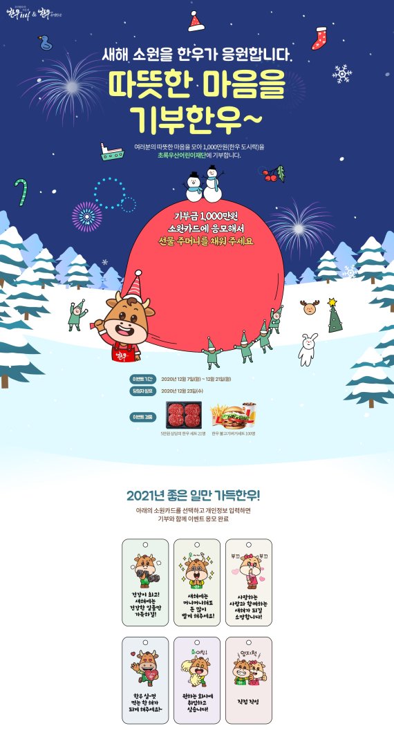특히 내년 소띠해를 맞이해 희망 가득찬 소원도 빌고, 기부에도 참여하면 추첨을 통해 5만원 상당 한우세트(총 21명)와 한우 불고기 버거세트(총 100명)도 경품으로 받을 수 있다.