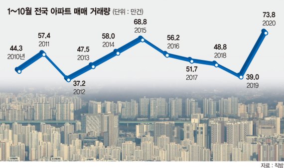 아파트 매매거래량은 올해 10월 기준 73만8000건으로 역대 같은 기간 최고치를 보였다. 코로나19로 4~5월은 아파트 매매 거래가 주춤한 양상을 보였지만 6~7월에는 월간 10만건 이상을 기록했다.