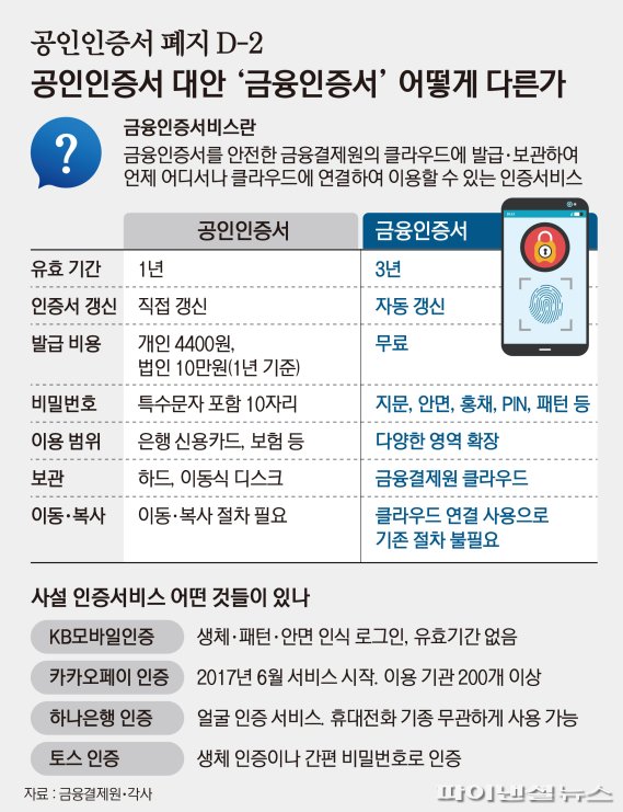 10일 개정된 전자서명법이 시행되면 공인인증서의 독점적 지위가 사라진다. 이에 따라 금융결제원은 공인인증서비스 이용 편의성을 개선하고 보안성을 강화한 금융인증서를 발급했다. 금융인증서란 금융결제원과 22개 은행이 공동으로 준비한 금융 인증서비스다.