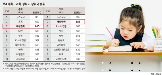 이번 연구에서 우리나라 초4 학생의 성취도는 58개국 중에서 수학 3위, 과학 2위를 기록하였고, 중2 학생의 성취도는 39개국 중에서 수학 3위, 과학 4위로 나타나 상위 수준을 보였다.