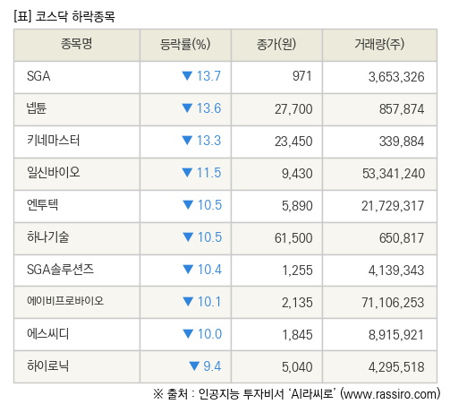 [fnRASSI]장마감, 코스닥 하락 종목(SGA -13.7% ↓)