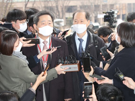 이석웅(가운데 왼쪽), 이완규(가운데 오른쪽) 변호사가 윤석열 검찰총장 측 변호인으로 징계위원회에 출석하기 위해 10일 오전 과천 법무부 청사로 들어서며 취재진의 질문에 답하고 있다. 사진=박범준 기자