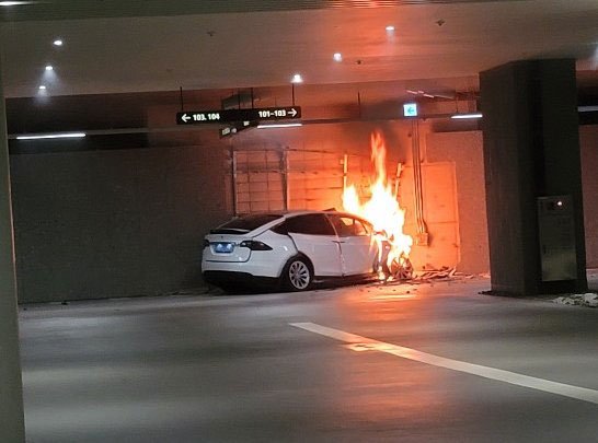 전기차 테슬라가 주차장 벽면과 충돌해 화재가 발생했다. 이 사고로 1명이 사망하고 2명이 다쳤다. 운전자는 차량이 갑자기 통제가 되지 않아 사고가 일어났다고 진술했다.