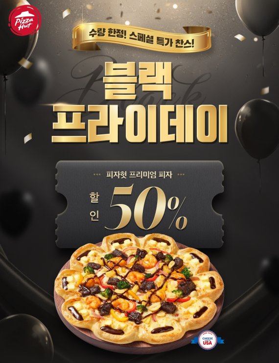 [파이낸셜뉴스] 한국피자헛이 블랙프라이데이(블랙알리오 스테이크 피자+프라이데이)를 진행하며, 모든 프리미엄 피자 라지 사이즈 포장 주문 시 50% 할인 쿠폰을 제공한다고 11일 밝혔다.