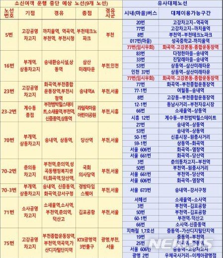 시 관계자는 "시민 불편을 줄이기 위해 유사대체 노선을 마련했다"면서 "부천시 홈페이지를 참고해 달라"고 전했다.