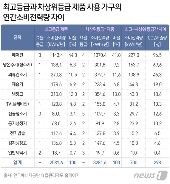 (서울=뉴스1) 윤다정 기자 = 집에서 흔히 쓰는 가전제품을 최고 에너지 소비효율등급 제품으로 바꿀 경우 연간 14만9000원을 절약할 수 있는 것으로 나타났다. 에너지는 약 21%, 이산화탄소(CO₂) 배출량은 약 298㎏을 줄일 수 있다. 특히 에어컨의 연간소비전력량 차이가 227kWh로 가장 컸다.