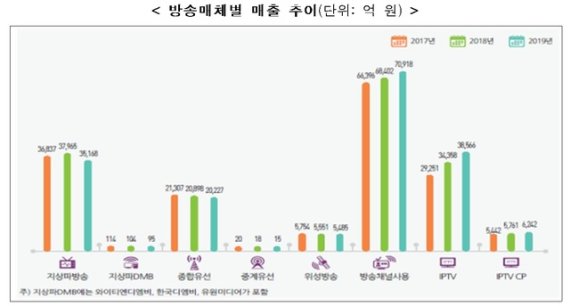 유료방송사업자의 총 매출액은 약 6조4000억 원으로 전년대비 3471억 원 증가(5.7%)했으며, 2019년에 최초로 IPTV 매출액이 지상파 매출액을 넘어선 것으로 파악됐다.