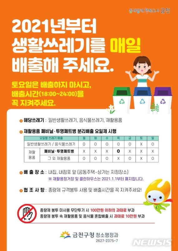 구는 내년 1월1일부터 토요일을 제외한 모든 요일에 생활쓰레기(일반생활쓰레기, 음식물쓰레기, 재활용품)를 배출할 수 있도록 생활쓰레기 매일수거제를 시행한다. 각 가정에서는 일반생활쓰레기와 음식물쓰레기는 각각의 종량제봉투에 담아 배출하면 된다.