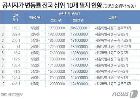 국토교통부가 23일 공개한 내년 1월1일 기준 표준지 52만 필지의 공시지가(안)에 따르면, 올해 전국 공시지가 상위 10개 필지는 지난해와 같이 서울 명동 건물들이 순위 변동 없이 차지했다.