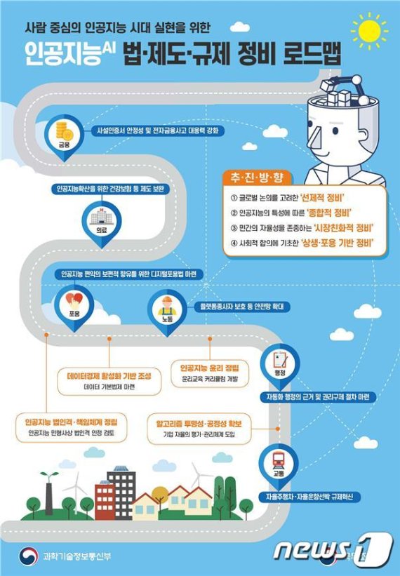 24일 과학기술정보통신부와 국무조정실은 정세균 국무총리가 주재하는 국정현안점검조정회의에서 인공지능 법·제도·규제 정비 로드맵을 확정·발표하며 AI 시대를 준비해나가기 위한 법적 기반을 마련해 나가겠다고 밝혔다.