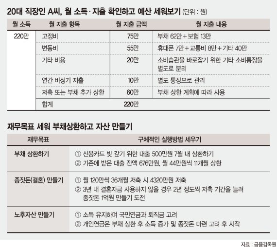 A씨의 월 세후 소득은 220만원이다. 고정 지출은 부채 62만원, 보험 13만원 등 75만원이다. 변동 지출은 휴대폰 7만원, 교통비 5만원, 기타 40만원 등 55만원이다.