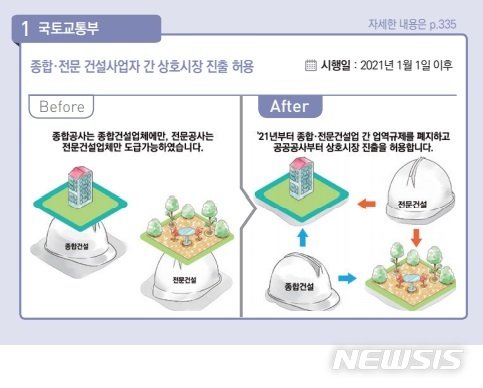 28일 정부가 내놓은 '2021년부터 이렇게 달라집니다'에 따르면 국토교통부는 개정 건설산업기본법 시행으로 내년 1월1일 공공기관이 발주하는 공사부터 종합건설업과 전문건설업 간 업역을 폐지하기로 했다.