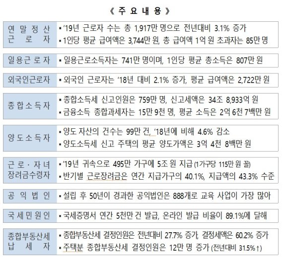 국세통계연보에 따르면 지난해 귀속 연말정산을 신고한 근로자는 전년대비 3.1% 증가한 총 1917만명이다. 1억원 초과 연봉자는 전년 대비 6.2% 증가한 85만2000명이었고, 전체 근로자 중 4.4%였다. 평균 급여는 3744만원으로 전년에 비해 2.7% 증가했다. 일용근로소득자 수는 740만6000명이며 이들이 벌어들인 연간 총소득은 59조8000억원이다. 일용근로소득자 수와 연간 총소득이 모두 전년에 비해 4.7%, 4.9%씩 각각 감소한 것으로 나타났다. 외국인 근로자는 58만5000명으로 전년에 비해 2.1% 증가했다. 이들의 총급여액은 15조9000억원으로 이 역시 전년대비 7.5% 증가한 것으로 나타났다. 외국인 근로자의 1인당 평균 급여액은 2722만원으로 전년보다 5.3% 증가했다.
