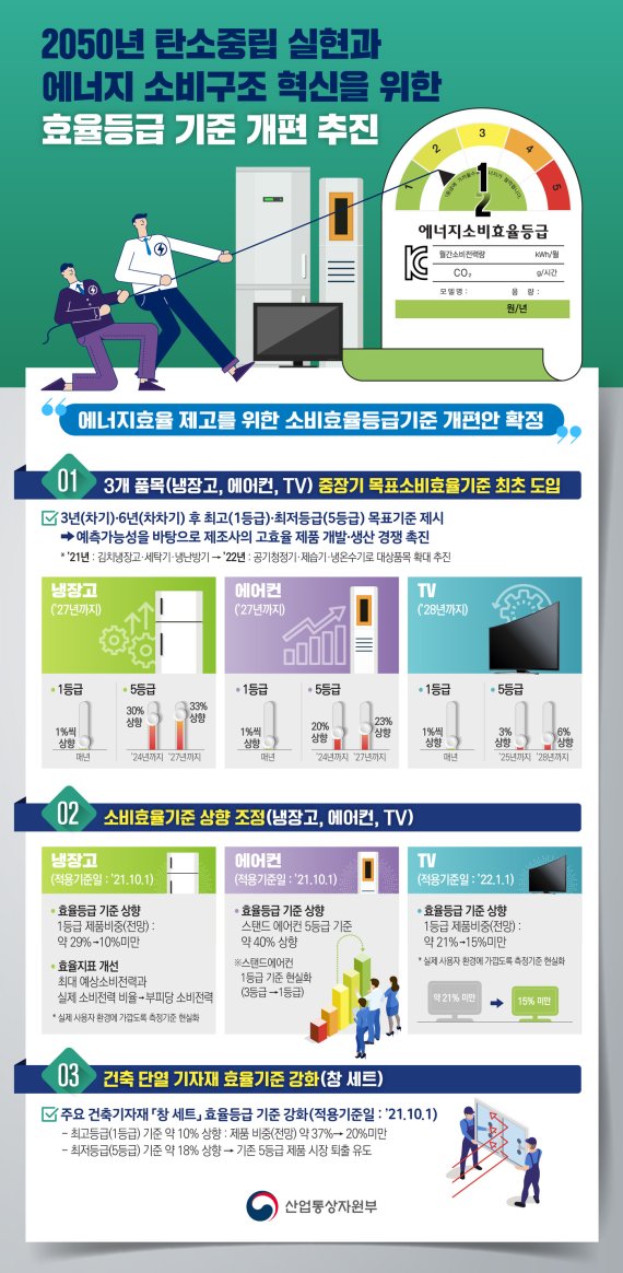 이번 개정안에서는 냉장고·에어컨·TV 등 3개 주요 가전제품의 효율기준을 높이는 데 초점을 맞췄다. 특히 에너지소비효율등급 기준에 중장기 목표소비효율기준을 최초로 도입했다. 이를 통해 제조사가 기준 목표를 감안해 고효율 제품 개발·생산을 적극 추진할 수 있도록 유도한다는 방침이다.