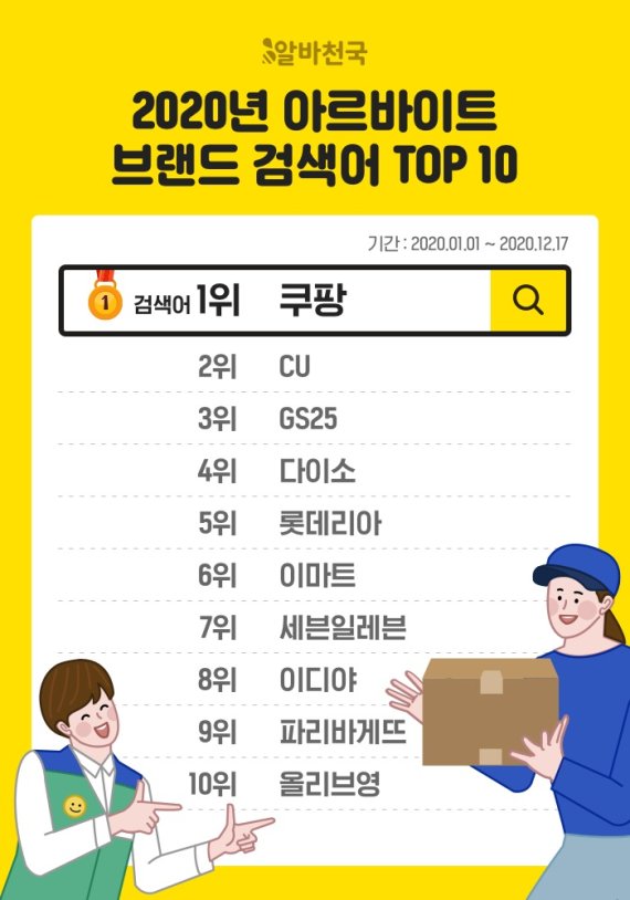 [파이낸셜뉴스] 구인구직 아르바이트 전문 포털 ‘알바천국’이 2020년 알바천국 홈페이지와 모바일 앱에서 검색된 아르바이트 브랜드 키워드를 분석해 1위부터 10위까지 순위를 12월31일 발표했다.가장 많이 검색된 아르바이트 브랜드는 ‘쿠팡’으로 집계됐다. ‘쿠팡’ 키워드는 전체 검색어 순위에서도 브랜드 키워드로는 유일하게 2020년 매월 꾸준히 10위권 내를 기록해왔다.