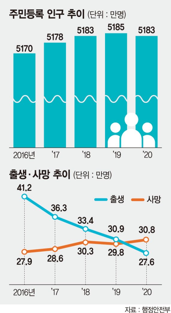 12월 31일 기준 주민등록인구는 총 5182만9023명으로 집계됐다. 2019년 5184만9861명에 비해 2만838명이 줄었다. 사상 첫 인구감소다.