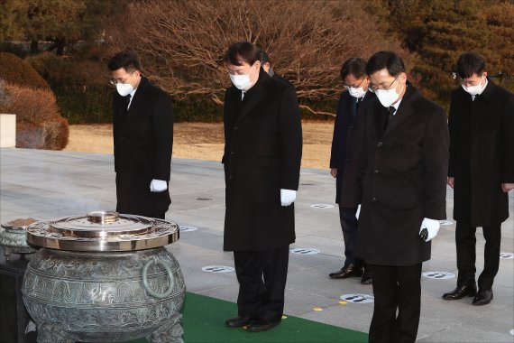 윤석열 검찰총장이 4일 오전 서울 동작구 국립서울현충원에서 조남관 대검 차장, 조상철 서울고검장, 복두규 대검 사무국장, 정연익 서울고검 사무국장과 함께 현충탑을 참배하고 있다. 사진=박범준 기자