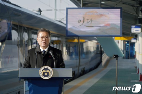 문 대통령은 "저탄소·친환경 열차 KTX-이음은 코로나의 어두운 터널을 지나 행복을 실어나를 희망의 열차"라며 "올해 우리는 코로나를 이기고 다시 북적이는 기차역에서 사랑하는 사람들과 만나게 될 것"이라고 밝혔다.
