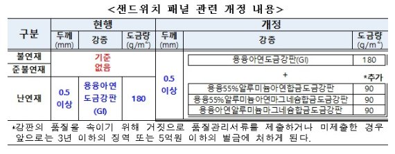 기존에는 샌드위치패널의 강판에 대한 규정이 난연재에만 있고, 불연·준불연재에는 부재했다. 더욱 안전해야할 불연‧준불연재료에 복합자재 강판에 대한 기준이 누락되면서 국민의 생명과 안전이 위협받아 왔다는 것이 개정 배경이다.